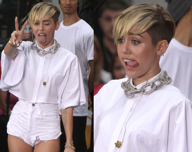 Miley Cyrus na zmianę obiecuje, że nie będzie się więcej pulicznie wypinać wywalając język i zapowiada, że "będzie nadal sobą". Jak na razie trzyma się tej drugiej wersji. Podczas występu w programie Today na Rockefeller Plaza powtórzyła niemal całą choreografię z rozdania nagród MTV. Nie miała tylko o kogo ocierać się pośladkami. Po kolejnym popisie Miley w jej obronie stanął... Pharrell Willams, który wyjaśnił: